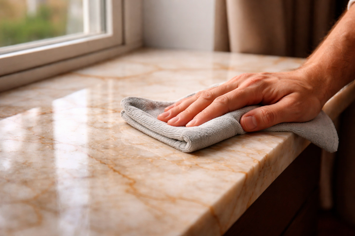 Сразу после установки (или раз в 3−5 лет) обработайте подоконник гидрофобизатором для камня. Средство заполняет поры, снижая впитываемость и упрощая уход. Для сухой уборки используйте мягкую микрофибровую ткань или замшу, удаляйте пыль и мелкий мусор ежедневно, чтобы предотвратить накопление абразивных частиц. Можно использовать нейтральные средства — для лёгких загрязнений подойдут растворы с нейтральным pH (без кислот и щелочей).